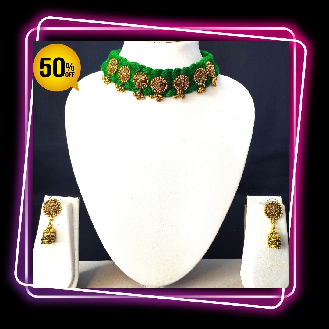 Elevate your style with Green Choker Necklace set! This classic piece adds a sophisticated touch to any outfit, making it perfect for formal occasions. Its versatile design matches effortlessly with any color ensemble. Experience the perfect blend of tradition and modernity with our Indo Western inspired jewellery.