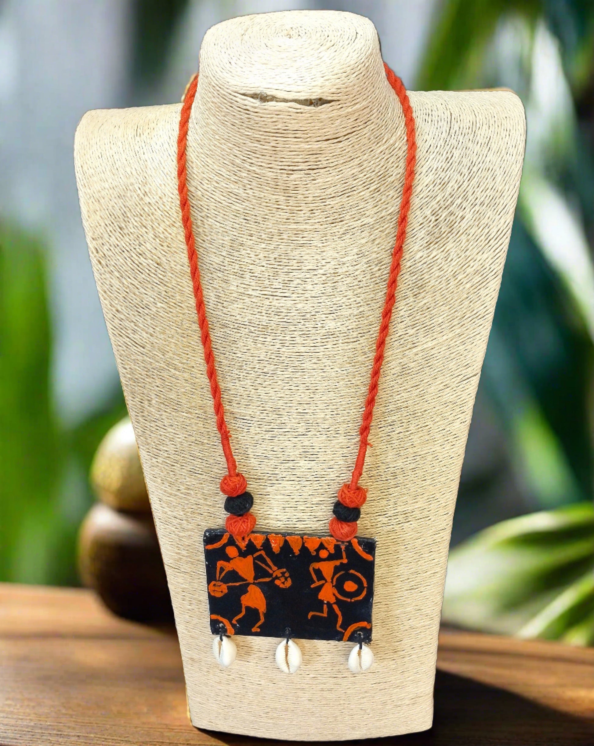 Elevate your style with our Orange Hand Painted Long Necklace. This unique piece features delicate madhubani hand painting, adding a touch of sophistication to any outfit. Perfect for the workplace or vacation, it effortlessly exudes a fusion look. Elevate your accessory game with this exclusive and tasteful necklace.