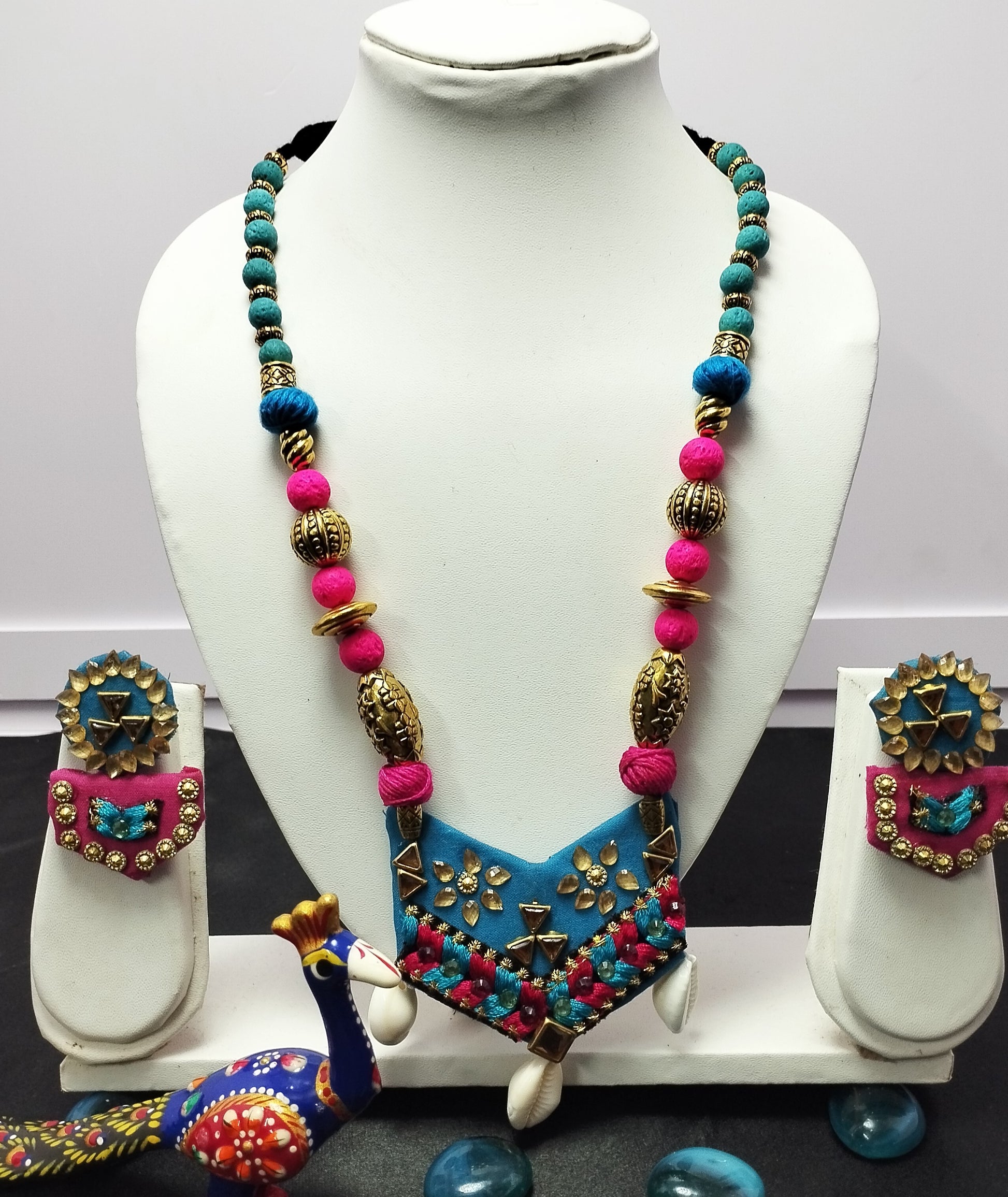 This beautiful, handmade jewellery features a pink and sky blue cotton fabric pendent and brass accents to complete the festive look. Add a bit of brightness to your wardrobe with this piece.Match with sky blue, pink,black and white colour lehenga